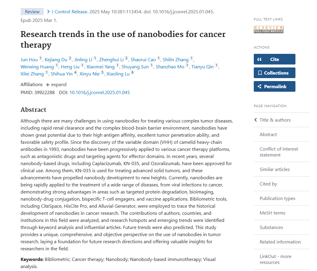 团队在一区杂志J Control Release发表论文Research trends in the use of nanobodies for cancer therapy。研究借助 CiteSpace、HisCite Pro 和 Alluvial Generator 等文献计量工具,梳理了纳米抗体在肿瘤研究领域的发展历程;分析了该领域内作者、国家及机构的研究贡献;并通过关键词分析及高影响力文献解读,明确了研究热点与新兴趋势,同时对未来发展方向进行了预测。该研究为纳米抗体在肿瘤研究领域的应用提供了独特、全面且客观的视角,不仅为未来研究方向奠定了基础,也为该领域的科研人员提供了具有价值的参考思路。