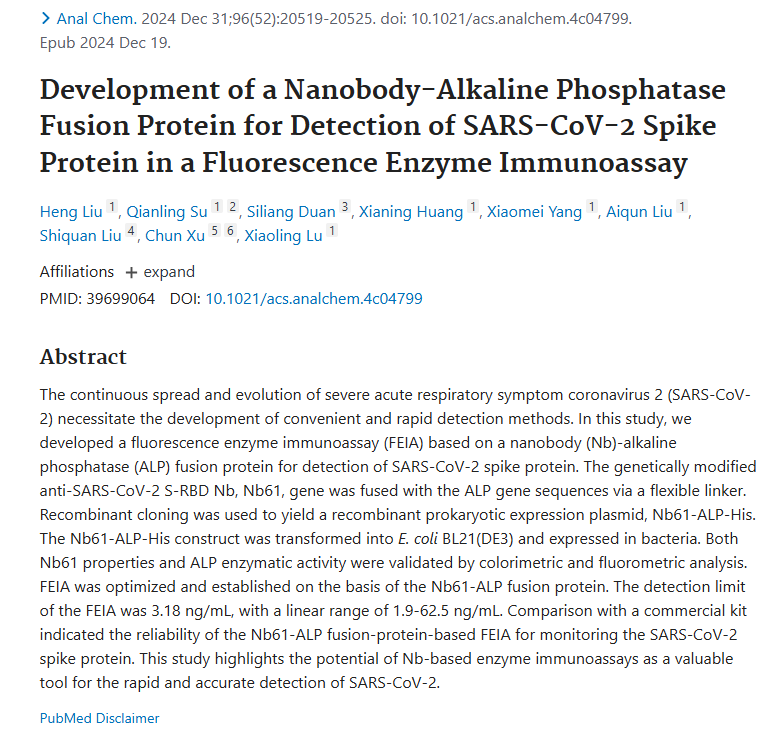 文章链接:Development of a Nanobody-Alkaline Phosphatase Fusion Protein for Detection of SARS-CoV-2 Spike Protein in a Fluorescence Enzyme Immunoassay - PubMed