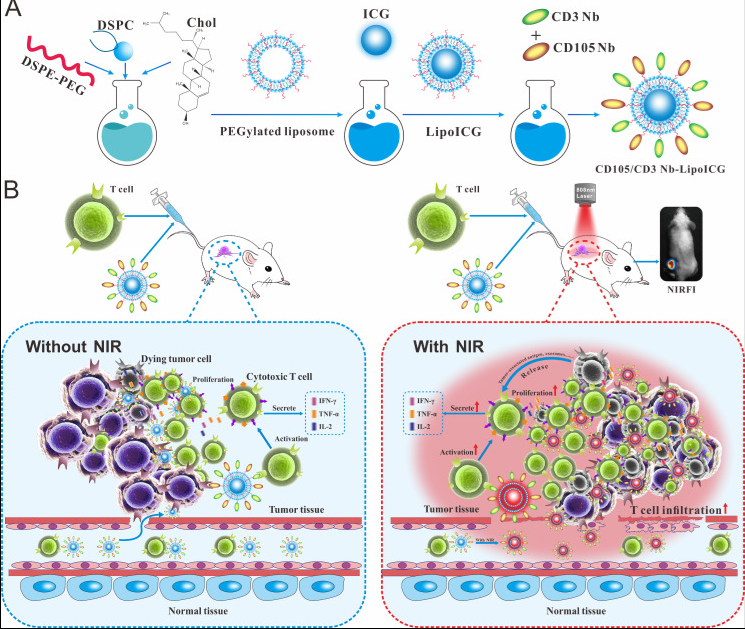 团队构建的Nb-MuTE以负载吲哚菁绿(ICG)的脂质体为载体,其表面偶联有靶向CD105和CD3的纳米抗体,对肿瘤细胞和T细胞均表现出优良的靶向性,并可促进肿瘤特异性T细胞的活化、增殖及细胞因子分泌。值得注意的是,在体外和体内实验中,吲哚菁绿介导的光热效应均可进一步增强 Nb-MuTE 所介导的T细胞的免疫抗肿瘤作用。