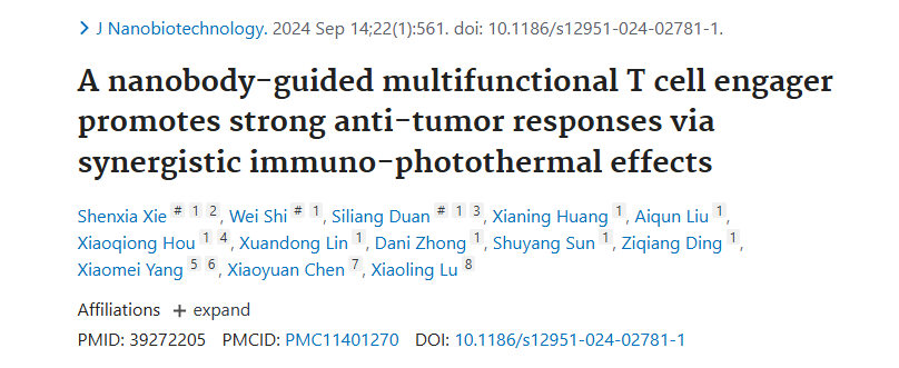 文章链接:A nanobody-guided multifunctional T cell engager promotes strong anti-tumor responses via synergistic immuno-photothermal effects - PubMed